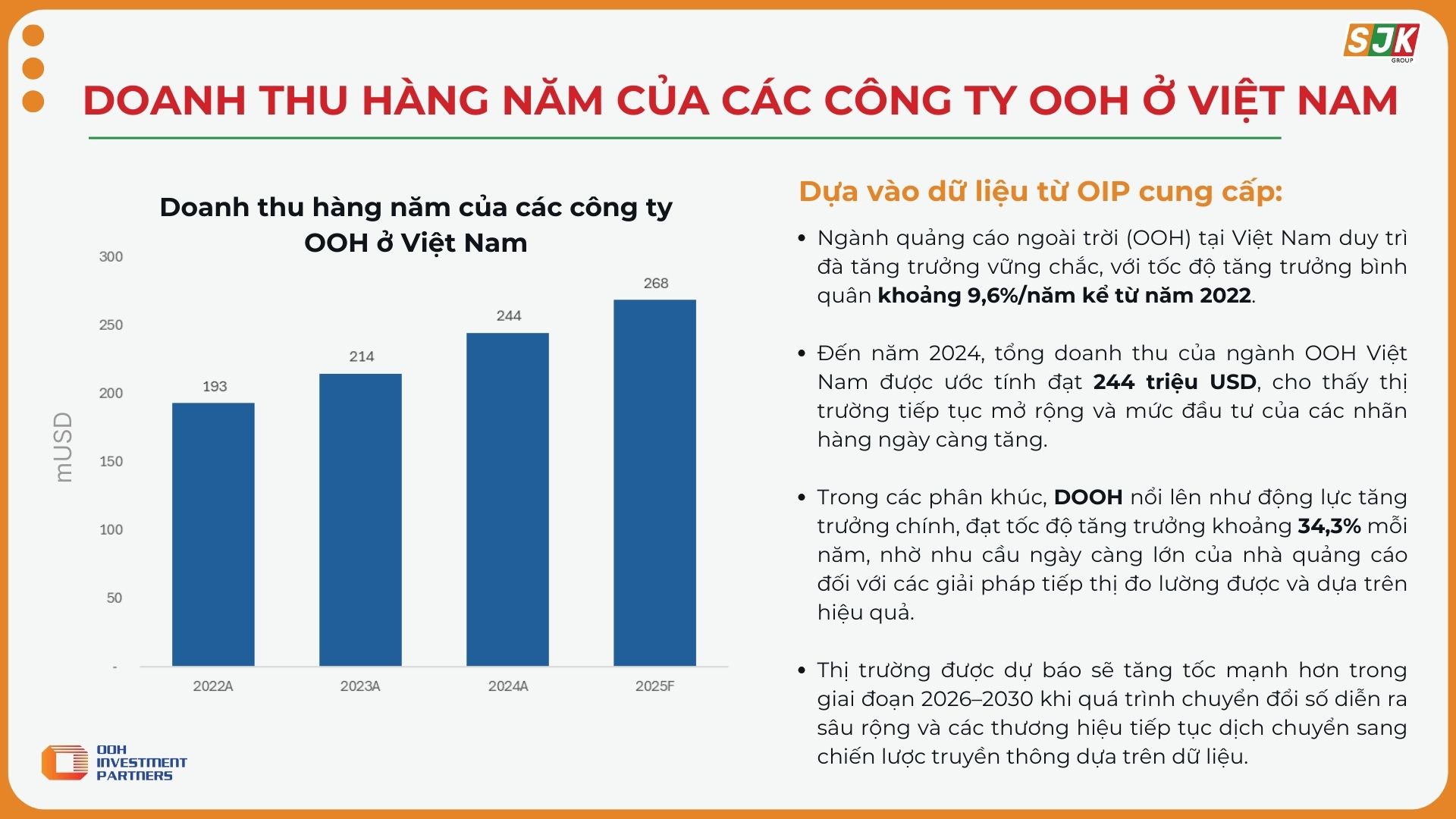Thị trường quảng cáo ngoài trời (OOH) Việt Nam đang bước vào giai đoạn tăng trưởng mới. Theo nhận định của OIP chi tiêu cho OOH dự kiến tăng 8-10% mỗi năm, trong đó phân khúc màn hình kỹ thuật số (DOOH) được dự báo tăng nhanh nhất nhờ tốc độ đô thị hóa và lưu lượng giao thông cao tại Hà Nội và TP.HCM.